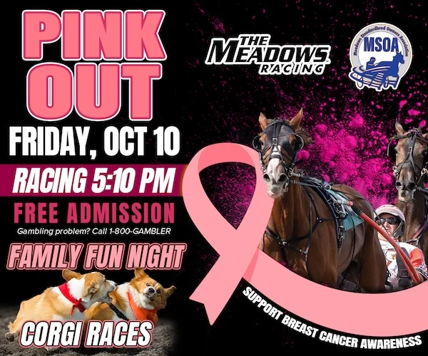 Friday, October 10 Post Time 5:10pm Join us for one of our favorite traditions—Pink Out at Hollywood Casino at The Meadows! Enjoy Live Harness Racing with Corgi Racing in between, family fun, and raising awareness in the fight against cancer.