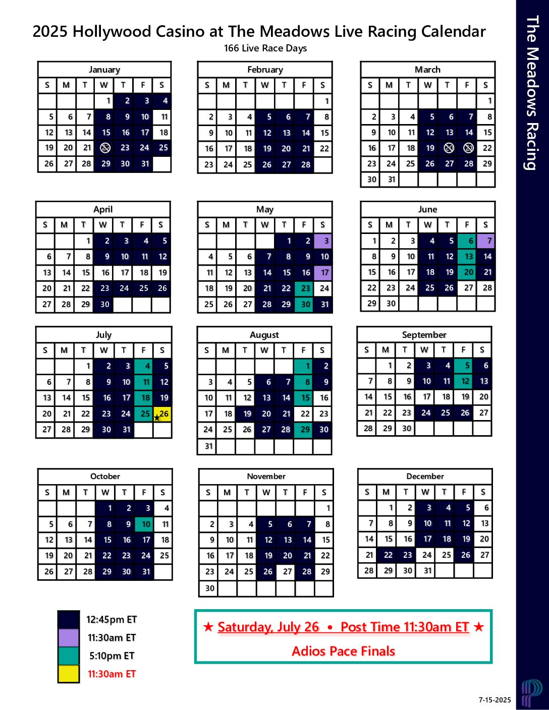 Racing Calendar The Meadows Harness Racing Calendar SIGN UP TO GET OUR EXCLUSIVE CONTENT Email(Required) CommentsThis field is for validation purposes and should be left unchanged.